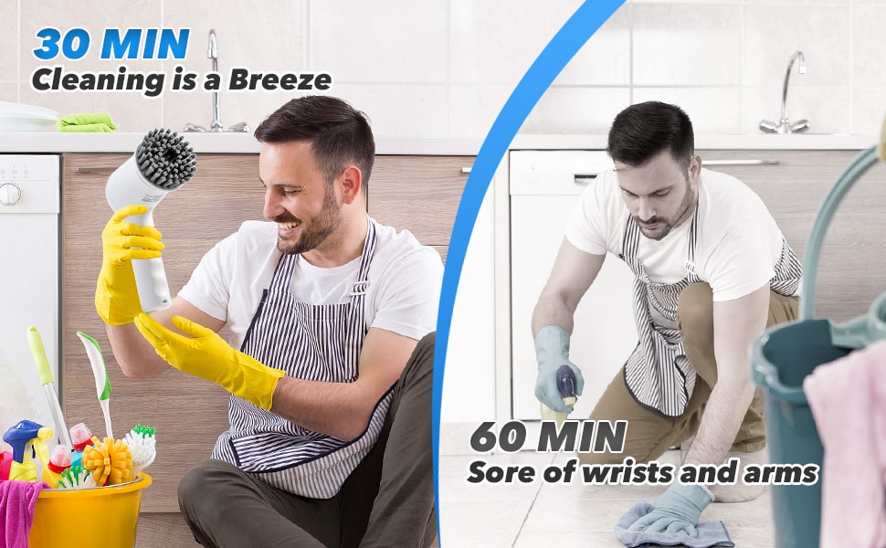 EZ Scrub Proās powerful spinning brush cuts your scrubbing time by about half! Avoid sore hands, knees, neck, back and damaged skin too from hours of manual scrubbing. Take back 10+ hours every week to spend with family, see friends, or just kick back. EZ Scrub Pro gives your weekends back to enjoy, not clean!